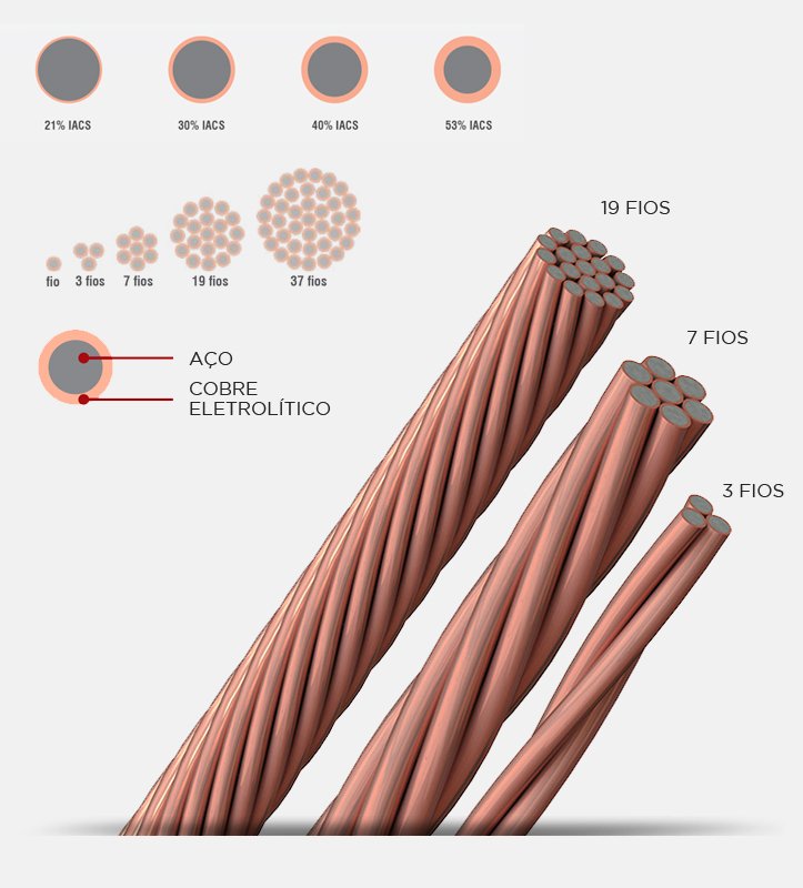 Condutor bimetálico que combina as propriedades mecânicas do aço com a alta condutividade e resistência à corrosão do cobre. Material bimetálico com o melhor dos dois metais, é a opção mais inteligente para projetos de malha de terra, contrapeso, cabo guarda e diversas outras aplicações.